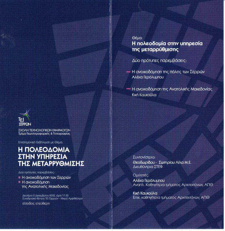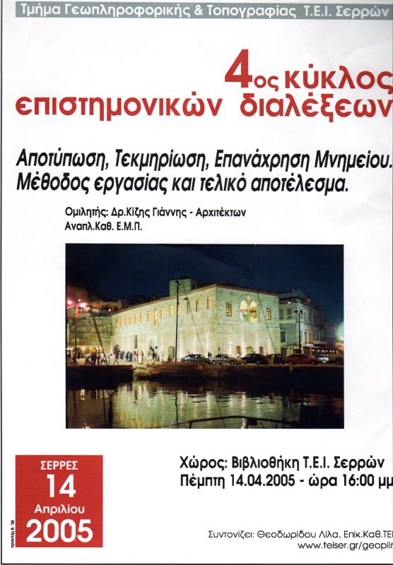 Οργανώσαμε έναν κύκλο 4 διαλέξεων, που στην πρώτη του φάση (2001), αφορούσε την τεχνολογία και τα λογισμικά τεκμηρίωσης της γεωπληροφορίας, στην δεύτερη (2002) την πολεοδομία και την κριτική των εργαλείων σχεδιασμού του αστικού χώρου , στην τρίτη (2004) τις κυκλοφοριακές τεχνικές και τη γεωγραφική τεκμηρίωση οικιστικών δικτύων και στην τέταρτη (2005), τις τεχνικές αποτύπωσης ενός μνημείου και την απανάχρηση του μέσα από ένα υλοποιημένο παράδειγμα.