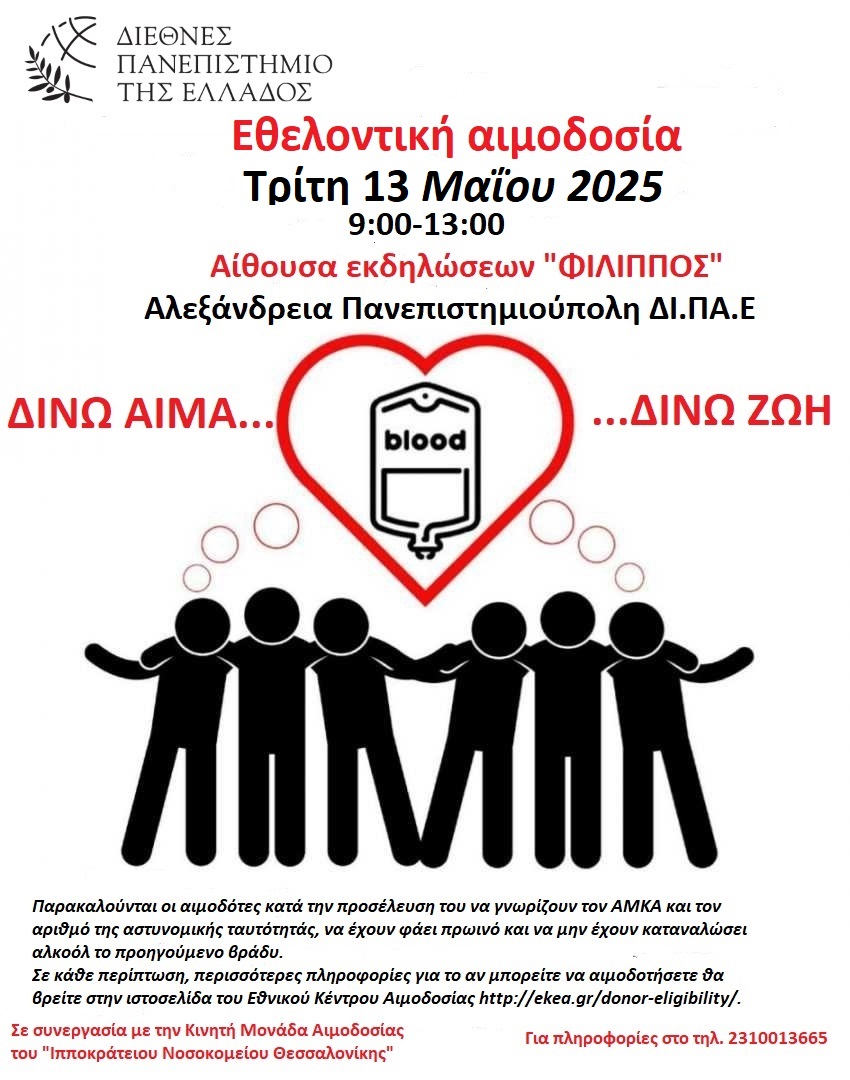 Πρόσκληση σε αιμοδοσία την Τρίτη 13 Μαΐου 2025 από 9πμ έως 1μμ στην αίθουσα εκδηλώσεων «ΦΙΛΙΠΠΟΣ» της Αλεξάνδρειας Πανεπιστημιούπολης του ΔΙ.ΠΑ.Ε