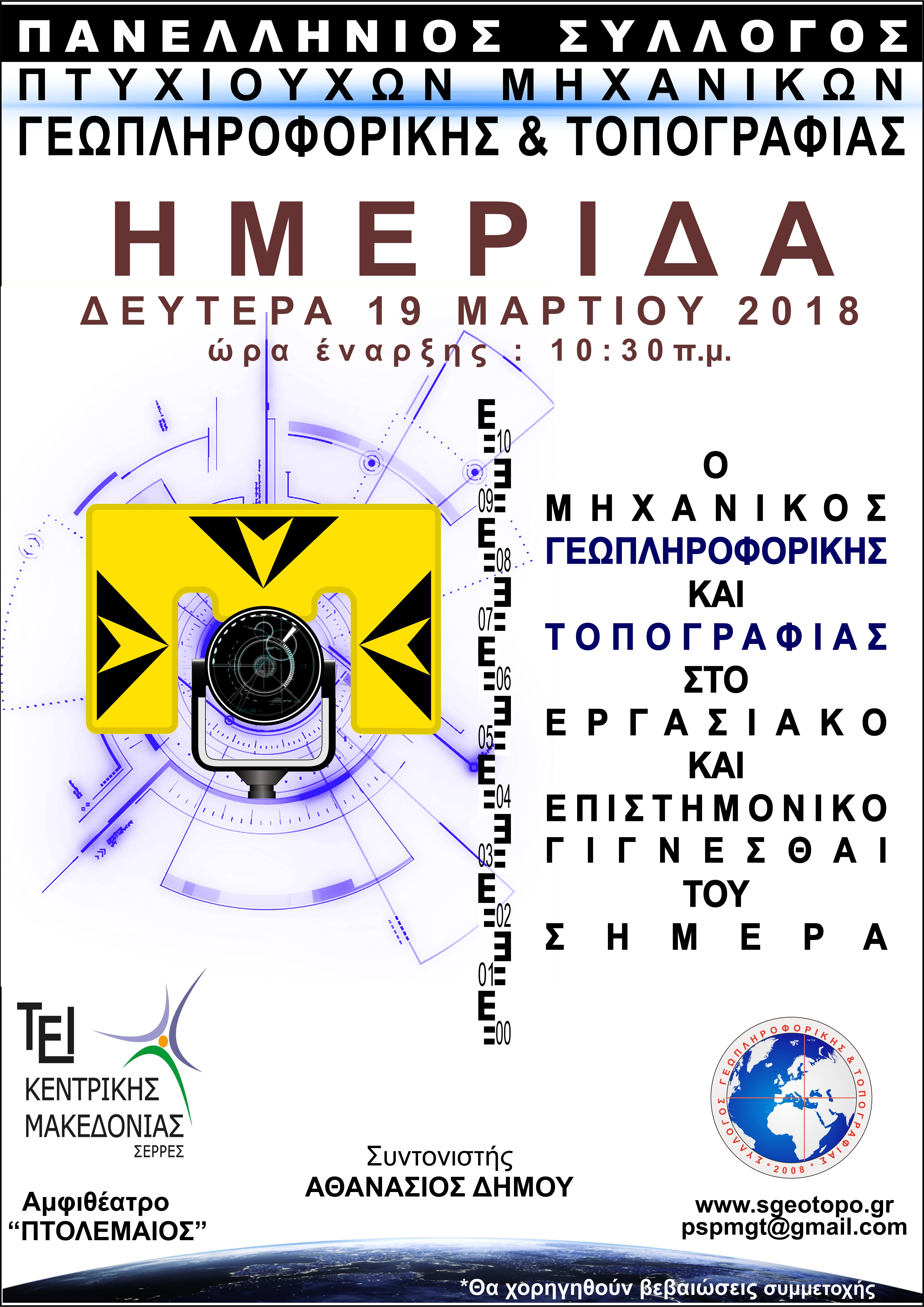Το ΔΣ και τα μέλη του Συλλόγου,με ιδιαίτερη χαρά σας προσκαλούν στην 1η ημερίδα του Πανελληνίου Συλλόγου Πτυχιούχων Μηχανικών Γεωπληροφορικής και Τοπογραφίας,στα πλαίσια των 10 ετών από την ίδρυση του, τη Δευτέρα 19 Μαρτίου 2018 και ώρα 10:00 στο αμφιθέατρο ΠΤΟΛΕΜΑΙΟΣ του τμήματος Γεωπληροφορικής και τοπογραφίας του ΤΕΙ κεντρικής Μακεδονίας (Σέρρες), με θέμα